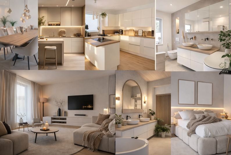 Neutral tones work particularly well in rental properties. Warm whites, beiges, sand tones or soft greys create a timeless base that appeals to a wide range of guests and adapts better over time.